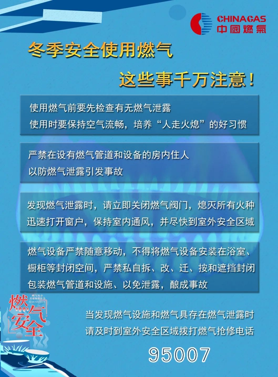冬季用气注意安全,使用燃气注意室内通风,燃气泄漏时,切勿开关和使用电器,立即开窗通风,养成“人走火熄”好习惯,务必记得“关阀”!燃气安全千万不可忽视,正确规范使用燃气,才能有效预防燃气事故的发生。